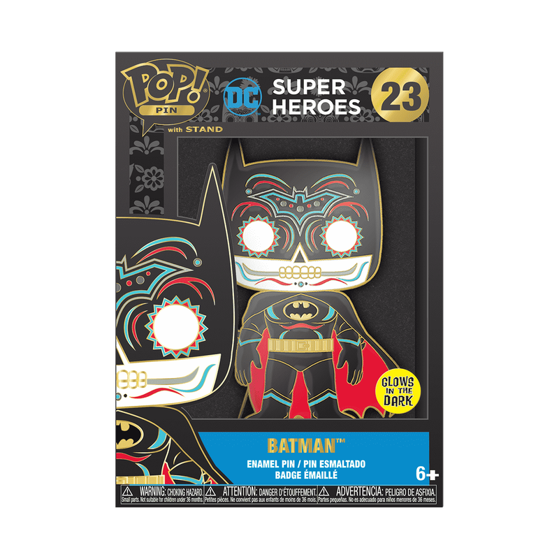 Decorate for your holiday traditions with a fun pop culture twist. It’s the slightly spooky, colorful Dia De Los DC Pop! Pin collection. Start your Dia De Los DC set with the glow-in-the-dark Pop! Pin Batman. Bring home Dia De Los DC Pop! Pin Batman to bring a pop of color and light into your display. Enamel pin features shiny gold-colored hardware and a built-in stand. Pin is approximately 4 in (10.2 cm) tall.