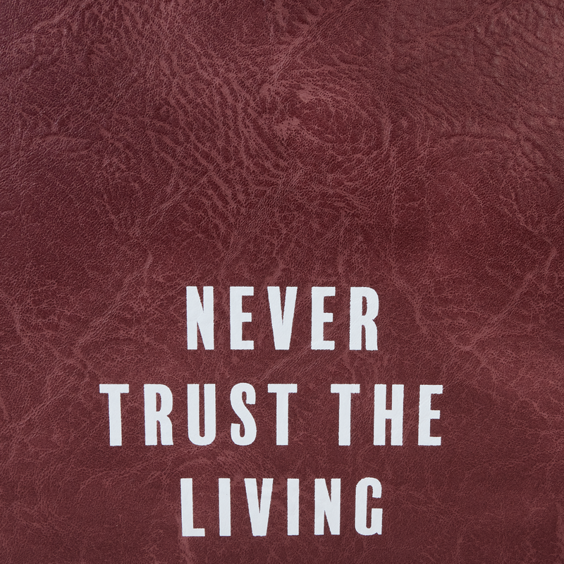 Book a trip for a spirited good time! Make a fashionable escape with our Beetlejuice: Handbook for the Recently Deceased Trader Pin Backpack. This functional and versatile backpack features a pin-trading “page” that’s perforated for storing and displaying your favorite pins. A front-flap strap secures the front “cover,” which features embroidered letters spelling out “Handbook for the Recently Deceased.” A clear material creates a shiny, laminated effect for viewing the artwork on the front cover. Just like the book in the movie, the “cover” for this “book” displays a couple holding hands, preparing to journey into the afterlife. “Weathered” brown faux leather creates an authentic look, and the lettering down the “spine” adds a realistic touch. Also, you can start your collection with an enamel pin of a Sandworm, which comes with this backpack. On the back, white lettering spells out a warning: “Never Trust the Living.” Pack just what you need for the day to visit your favorite haunts in style.