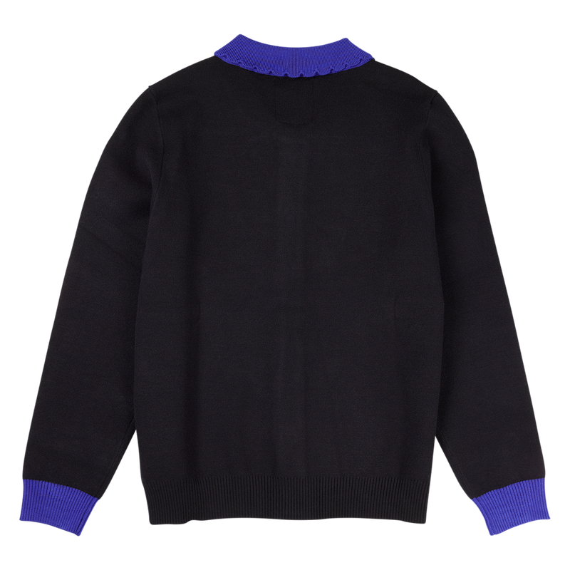 This cardigan features embroidered floral details on the sleeves. In the upper right corner of the torso, you’ll find an embroidered black cat. The collar is blue and features real buttons sewn on.
