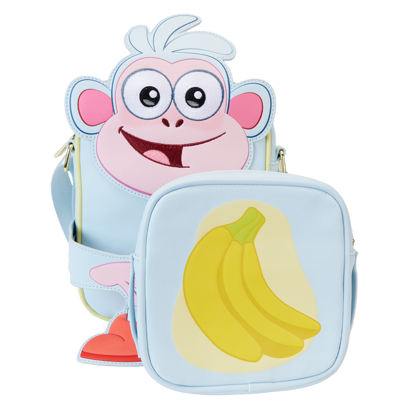 ¡Vámonos! Lead the way with our Loungefly Nickelodeon Dora the Explorer Boots Crossbuddies™ Bag. This fun, passport-style bag features Boots, his applique head and tufts of hair sticking up over the top of the accessory. Below, his signature red boots and tail, in applique detail, dangle. His applique arms also function as clasps for holding a coin bag that’s removable and reversible, so you can change up your look. Boots can display Map, and if you flip the compartment around, he’s holding bananas. On the back, Boots makes a delightful encore appearance with Dora. Pack just what you need for the day to take off on all kinds of adventures.