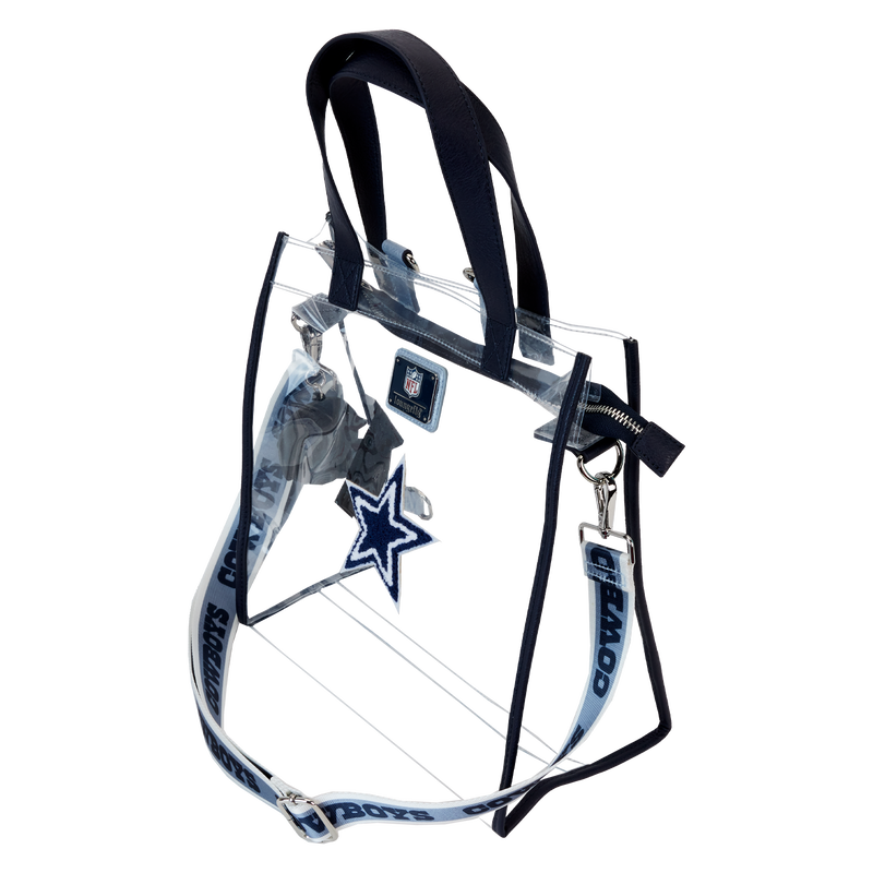 Feeling game-day ready? Cheer on your favorite football team with this convertible tote bag! The clear design makes it easy to bring your belongings into the stadium, and versatile shoulder straps help to keep your bag close as you wander the crowds. A chenille patch of the Cowboys logo, a helmet-shaped bag charm, and coordinating team colors give this bag an elevated look. No need to sacrifice your style at the big game – this accessory is the perfect combination of fashion and function.