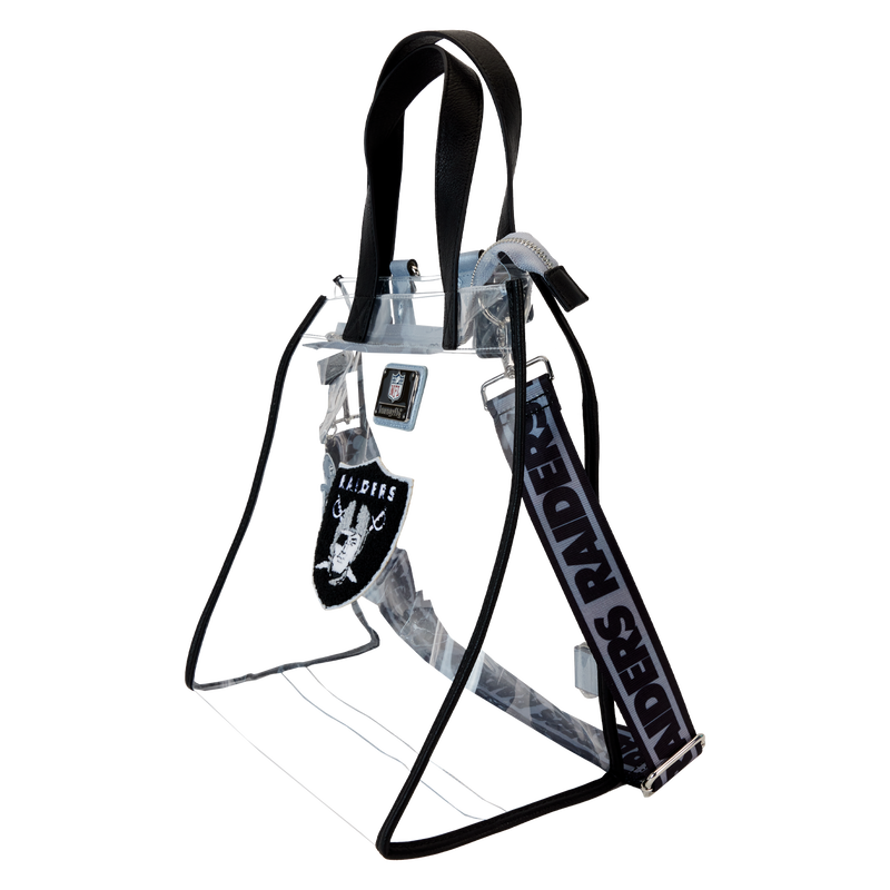 Feeling game-day ready? Cheer on your favorite football team with this convertible tote bag! The clear design makes it easy to bring your belongings into the stadium, and versatile shoulder straps help to keep your bag close as you wander the crowds. A chenille patch of the Raiders logo, a helmet-shaped bag charm, and coordinating team colors give this bag an elevated look. No need to sacrifice your style at the big game – this accessory is the perfect combination of fashion and function.