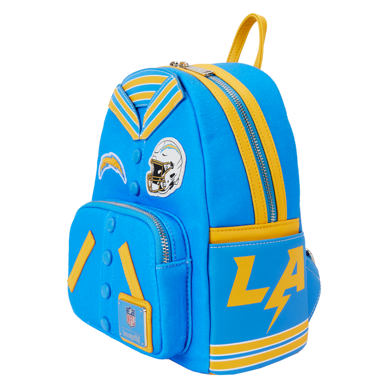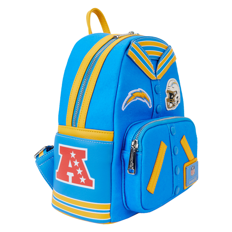Show your colors proud and true—you’ve got spirit, yes you do! Cheer your team in style! Our sturdy Los Angeles Chargers Varsity Mini Backpack will stand out in the crowd. This backpack, fashioned as a varsity jacket, scores big points in details. A chenille patch logo and helmet patch add a winning look, along with yellow, blue, and white jersey material appliques in Los Angeles Chargers colors. Real metal snaps also line the front for a “buttoned-up” look. Pack just what you need for the day to show off your team pride.